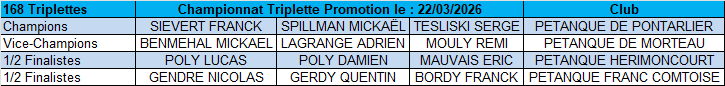 23/03 - Résultats du championnat triplette promotion du 22/03 à Besançon. Voir ci-dessous